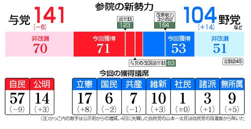 改憲勢力の非改選議席は無所属を含め計79。改憲勢力で3分の2に必要な85議席に4議席足りなかったため、首相は国民民主の一部などの協力も得て、早期の改憲発議を目指す意向だ。