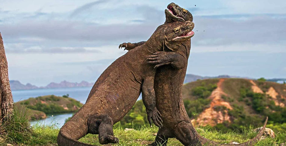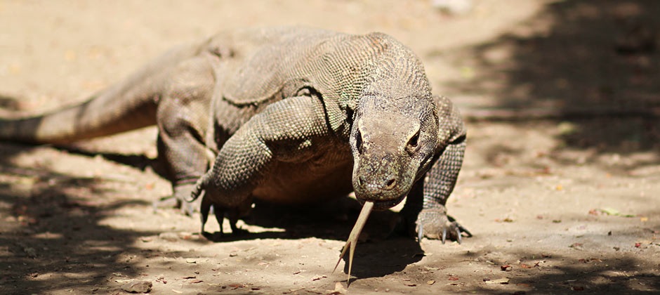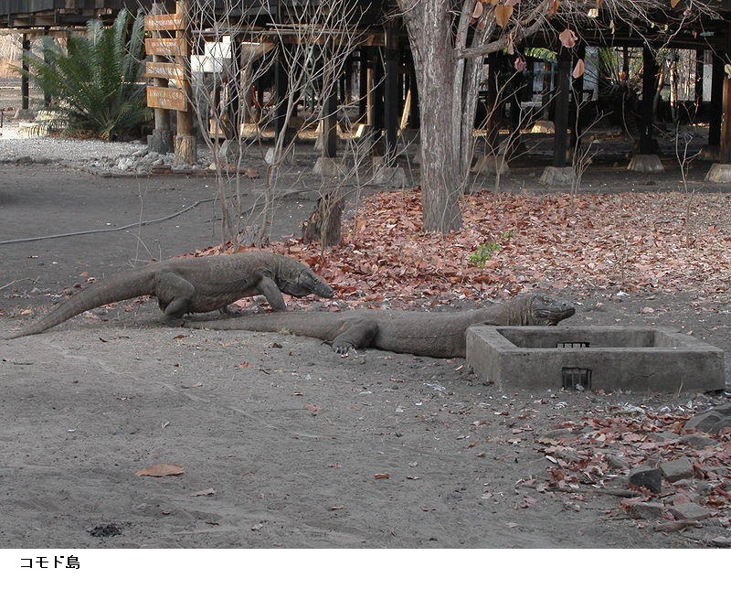 ジュラ紀の恐竜の生き残りとも言われ、野生の「コモドドラゴン」が確認できるのは「コモド国立公園」と周辺のフローレンス島のみのため、ワシントン条約「国際希少野生動植物種」に指定されています。大きいものでは成体で体長3m、体重130kg以上にも達します。顎には高度に発達した毒腺があり、噛まれると、麻痺、痙攣、出血によるショックを起こすことがあり、国立公園のレンジャーの同行がないトレッキングは許可されません。