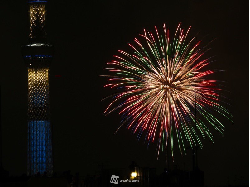 台風6号の影響が心配されたが、午後7時ごろに打ち上げが始まると、「おー」という歓声が上がった。隅田川沿いでは、家族連れやカップルがお酒を飲んだり、写真を撮ったりしていた。
