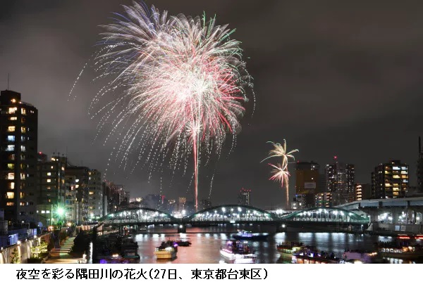東京・下町の夏の風物詩、隅田川花火大会が27日夜、東京都台東区と墨田区にまたがる会場で開かれ、95万9千人(主催者発表)の見物客が訪れた。約2万発の花火が次々と打ち上げられ、赤や金など色とりどりの大輪が夜空を染めた。