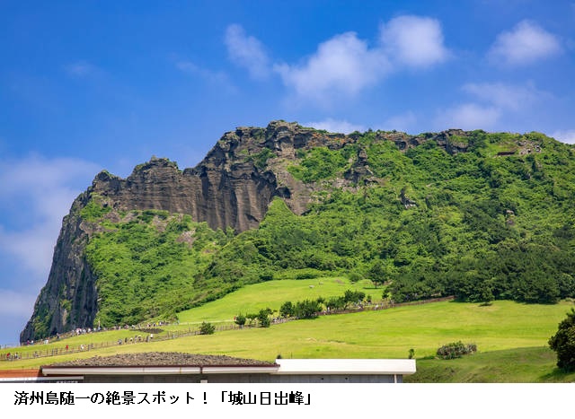 「城山日出峰(ソンサンイルチュルボン)」は、10万年も昔の海底火山の噴火から生まれた巨大な岩山で、ユネスコの世界遺産にも登録されている済州島のシンボルのひとつです。