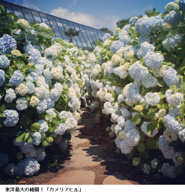 6万坪の広大な園内には、世界80ヶ国から集められた500種類の椿が約6,000本も植えられており、まさに「カメリアヒル=椿の丘」の名に恥じない東洋最大の椿園となっています。