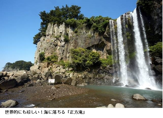 「正方滝」(ジョンバンポッポ)は、韓国で「死ぬまでに行きたい国内旅行地100選」にも選ばれている、済州島が誇る観光名所のひとつ。