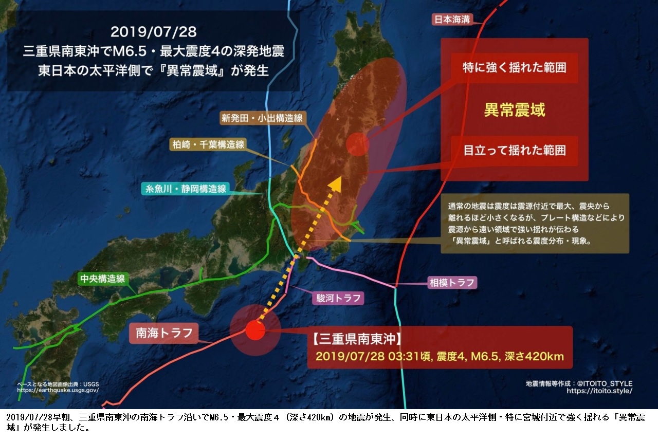 深発地震は頻度が少なく防災上の重要性が低いため、国は長期予測をしていない。東北大学の遠田晋次教授(地震地質学)は「深発地震でも、震源が深さ百数十キロだと大きい被害が起きる危険があり注意が必要」と話している。 (産経新聞 2019.7.28 20:37)