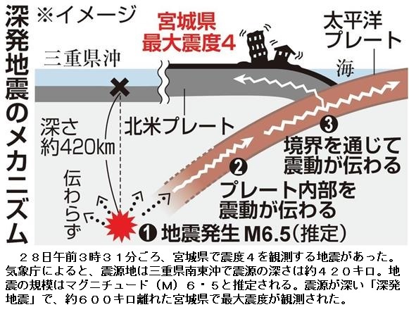 宮城で震度4、震源は600キロ離れた三重県沖 遠方が揺れる「深発地震」に注意 ―― 28日午前3時31分ごろ、宮城県で震度4を観測する地震があった。気象庁によると、震源地は三重県南東沖で震源の深さは約420キロ。地震の規模はマグニチュード(M)6.5と推定される。震源が深い「深発地震」で、約600キロ離れた宮城県で最大震度が観測された。