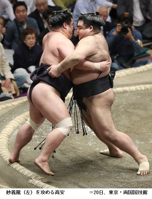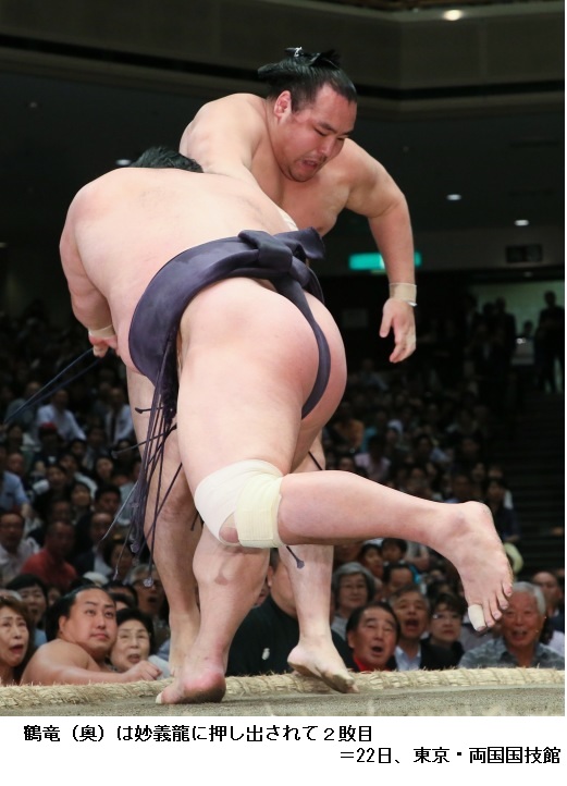 妙義龍に横綱鶴竜は妙義龍が押し出しで勝ち、鶴竜は2敗となりました。