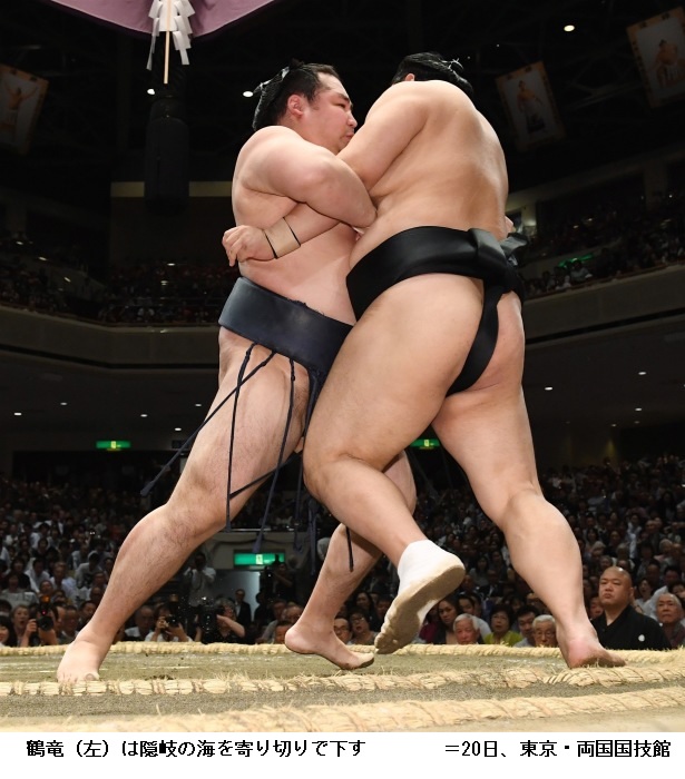 隠岐の海に横綱 鶴竜は、鶴竜が寄り切りで勝ち越しを決めました。