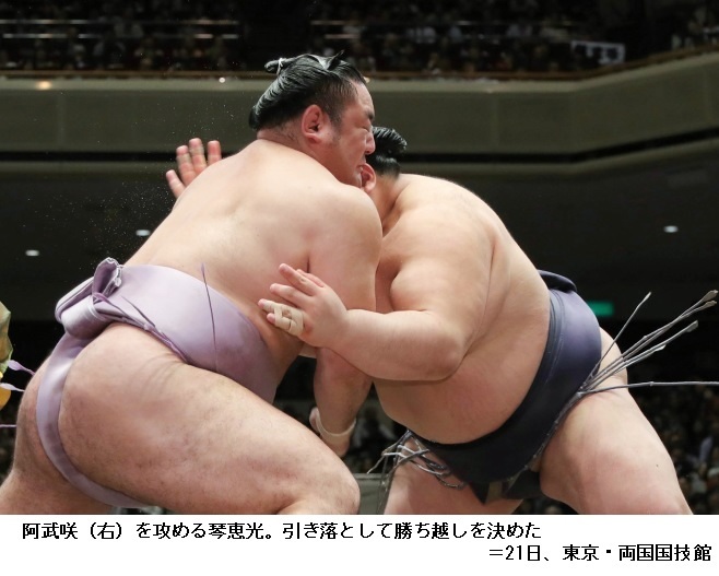 阿武咲に琴恵光は琴恵光が引き落としで勝ち、幕内4場所目で初めての勝ち越しを決めました。
