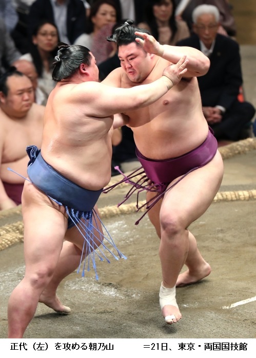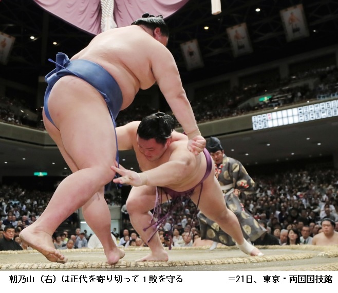 佐田の海に朝乃山は朝乃山が寄り切りで勝ちました。朝乃山は10勝目を挙げ1敗を守りました。