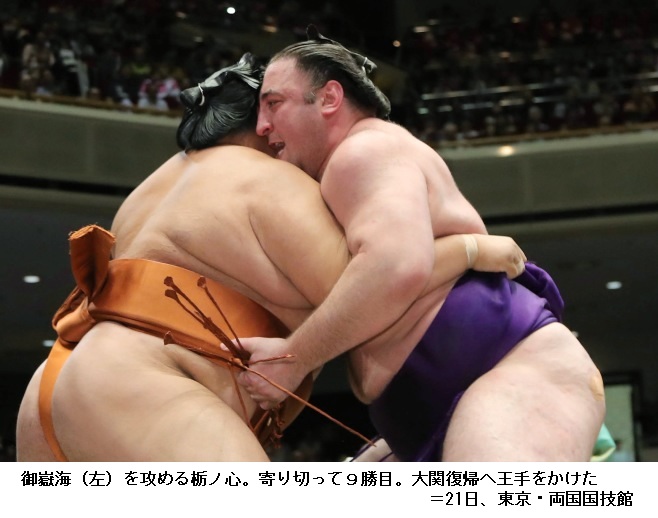 栃ノ心に御嶽海は、栃ノ心が寄り切りで勝って9勝目を挙げ、大関復帰まであと1勝としました。