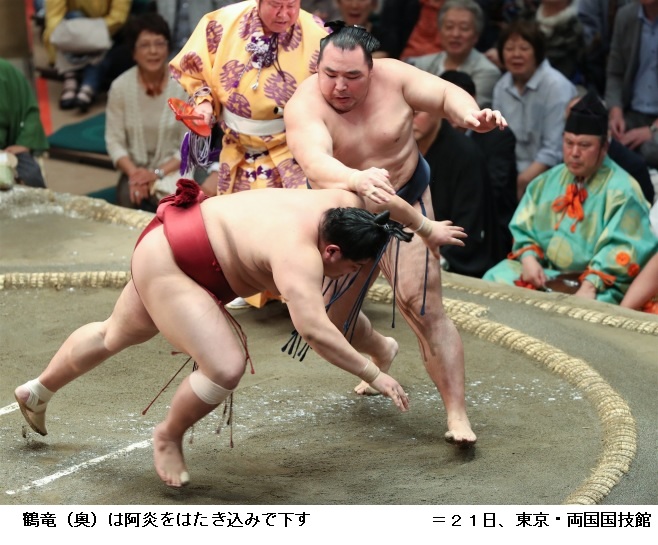 横綱 鶴竜に阿炎は鶴竜がはたき込みで勝ち、1敗を守りました。
