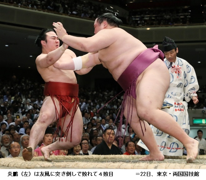 炎鵬に友風は友風が突き倒し。新入幕の炎鵬は7勝目を挙げてから2連敗です。
