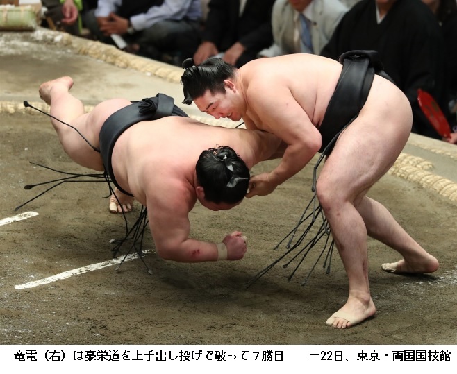大関豪栄道に竜電は竜電が上手出し投げ。