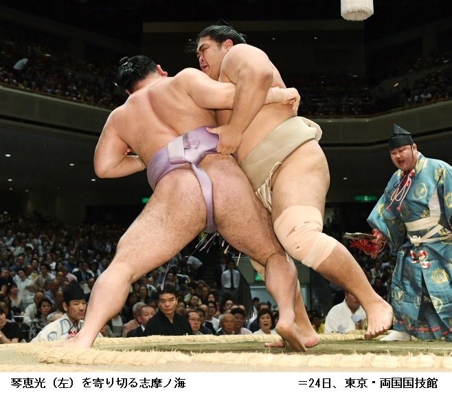 琴恵光は7勝目、「がまんできた。最後まで攻めきることを意識して土俵に上がった。好調の要因は、自分から先に攻められていて最後まで諦めないところだ」と分析しました。21日の幕内で初めての勝ち越しがかかる一番に向けては「目の前以外のことは考えられない。結果はあとからついてくる」と淡々と話していました。