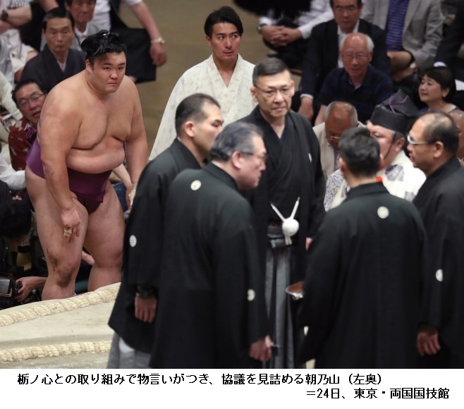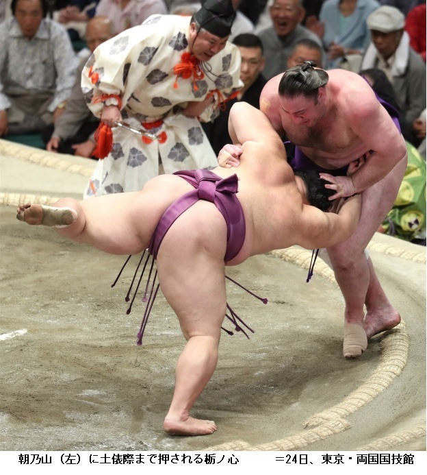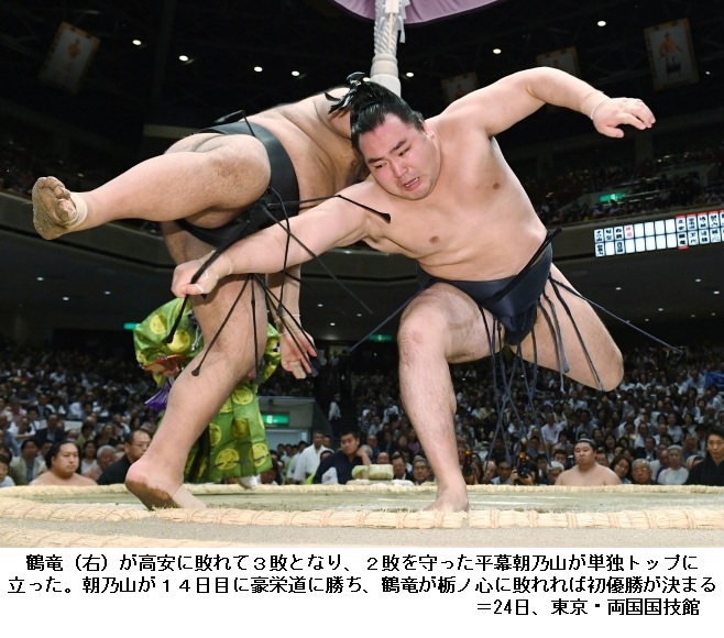 夏場所11日目 横綱 鶴竜と関脇 栃ノ心が敗れて2敗に後退 ―― 大相撲夏場所は11日目横綱鶴竜と関脇栃ノ心が敗れて2敗に後退し平幕の朝乃山がただ1人1敗を守って、優勝争いの先頭に立ちました。