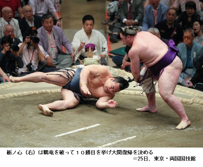大相撲 夏場所10日目 鶴竜など3人が1敗守る ―― 大相撲夏場所は10日目、横綱 鶴竜と関脇 栃ノ心、平幕の朝乃山の3人が1敗を守りました。栃ノ心は大関復帰まであと1勝です。