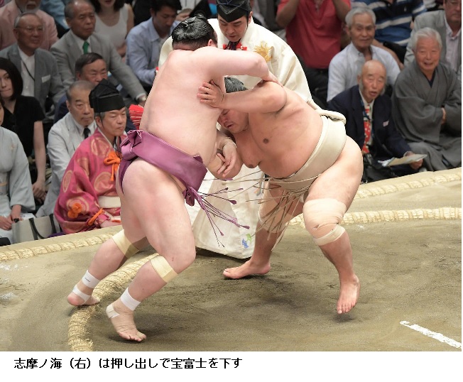 宝富士に志摩ノ海は、新入幕の志摩ノ海が押し出しで勝って10勝目を挙げました。