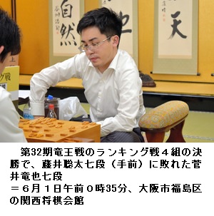藤井七段、千日手経て勝利 竜王戦決勝トーナメント進出 ―― 将棋の高校生棋士、藤井聡太(そうた)七段(16)が31日、第32期竜王戦(読売新聞社主催)ランキング戦4組の決勝で、菅井竜也(たつや)七段(27)に勝ち、広瀬章人(あきひと)竜王(32)への挑戦権を争う決勝トーナメント進出を決めた。日本将棋連盟によると、プロデビューから3期連続で竜王戦のランキング戦で優勝したのは藤井七段が初めて。
