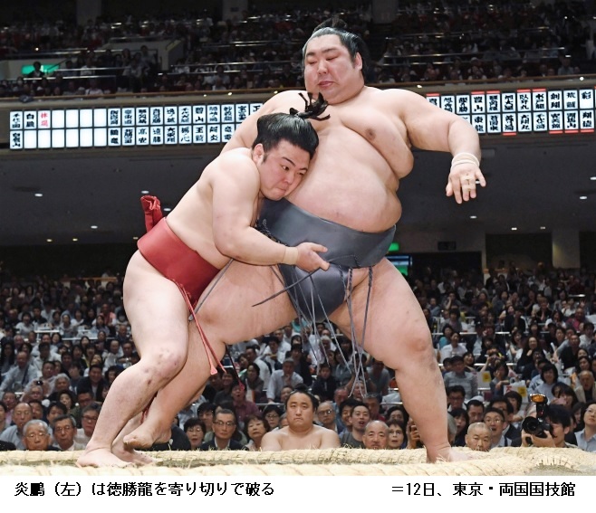 返り入幕の徳勝龍に新入幕の炎鵬は、炎鵬が寄り切り。