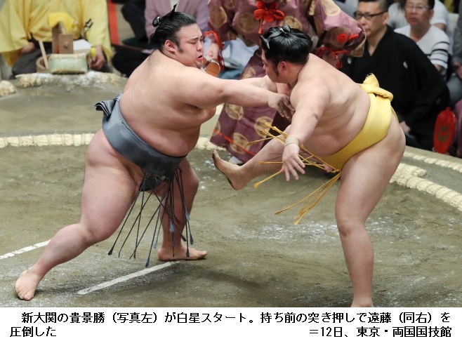 大相撲 夏場所初日 新大関の貴景勝が白星スタート ―― 大相撲の令和最初の本場所となる夏場所が、東京・両国の国技館で初日を迎え、新大関の貴景勝は平幕の遠藤に押し出しで勝って白星スタートです。