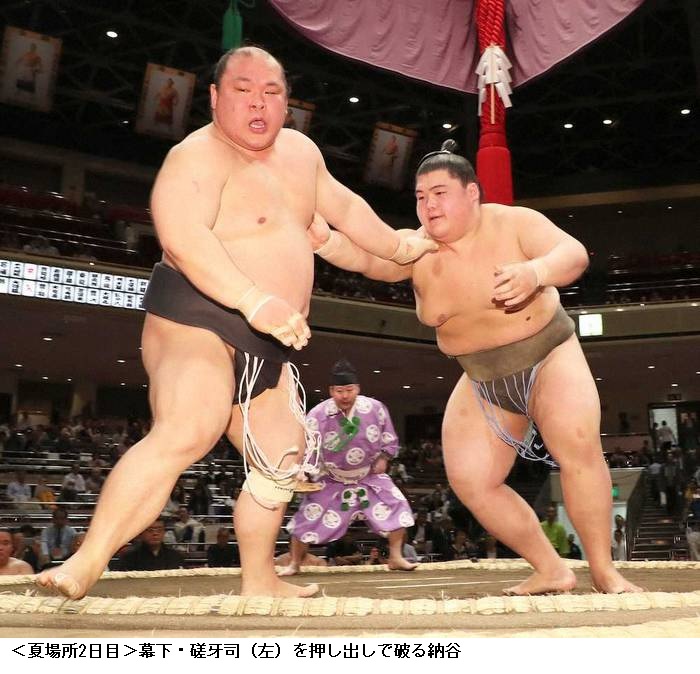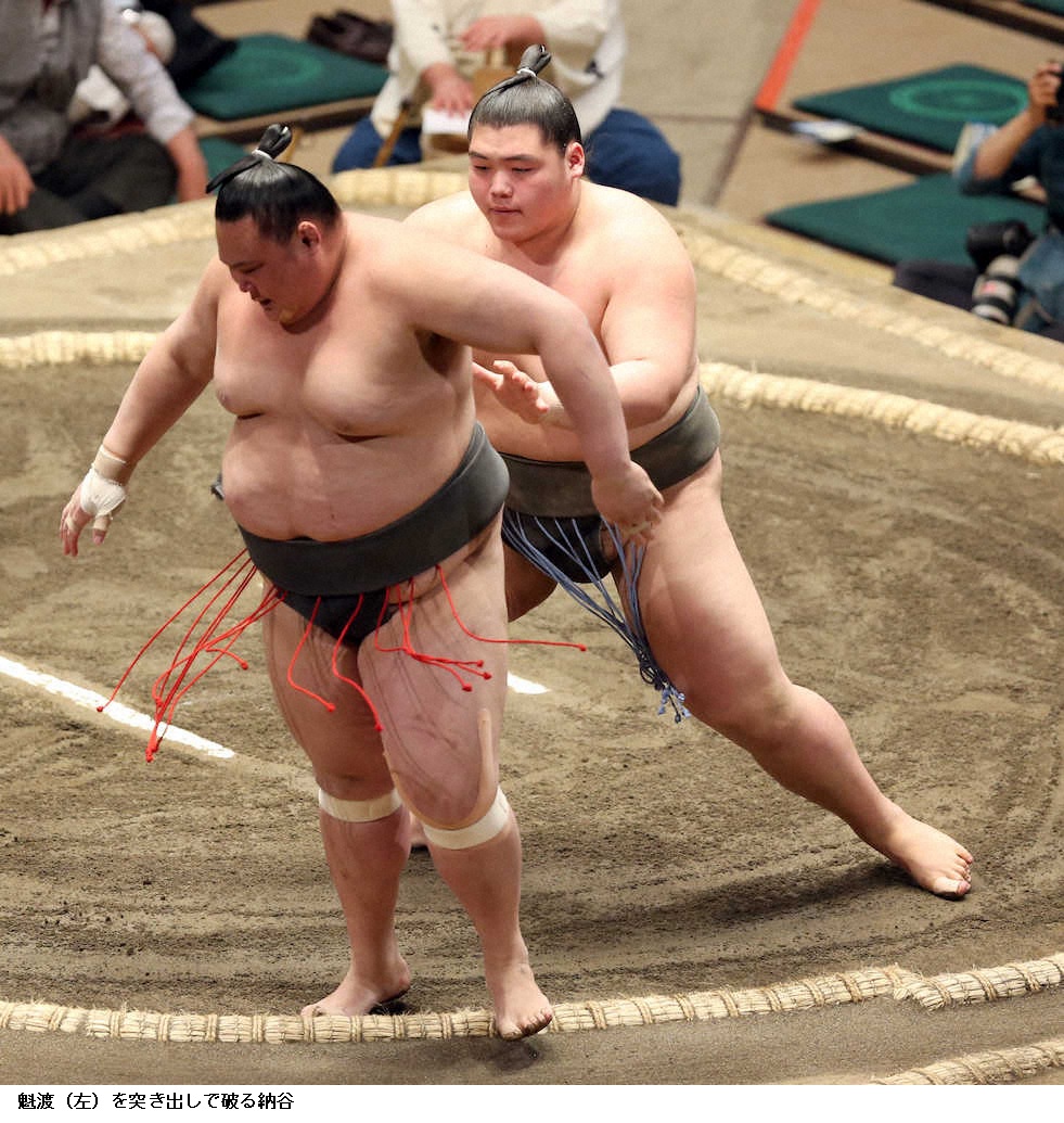 納谷、全勝対決制し勝ち越し!復帰・貴景勝に「気持ちの作り方学びたい」 ―― 元横綱・大鵬の孫、東幕下22枚目の納谷(19=大嶽部屋)が西幕下9枚目の魁渡(22=浅香山部屋)との全勝対決を突き出しで制し、4勝0敗で勝ち越しを決めた。遅れ気味に立ったが、長いリーチを生かして突っ張って攻め、最後は相手を反転させて土俵外へ出す完勝だった。「立ち合いと土俵際が勝負だと思った。腰が高かったけれど、流れはよかった」と冷静な口ぶりで振り返った。