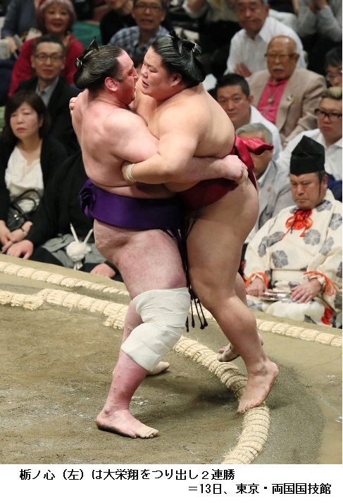 栃煌山に佐田の海は佐田の海が寄り切り。