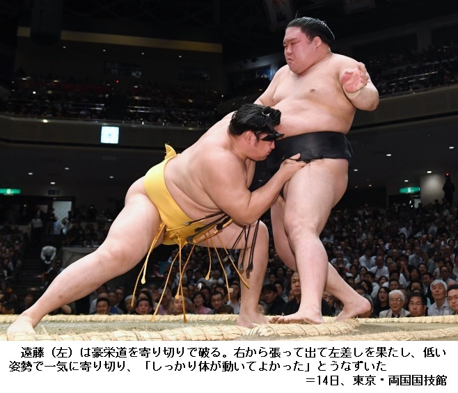 関脇 逸ノ城から白星を挙げた平幕の大栄翔は「気持ちいい。15日間あるので一日一番。一日に集中して最後まで持続力を大事にしたい」と話していました。