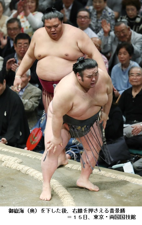 また、土俵下で取組を見た高田川審判長は「動作が痛々しく見える。相手の碧山もやりづらかったのではないか。足も出ていない」と19日の状態を評価したうえで「土俵に立つということは万全の状態だということだ。残りも出場するのなら痛々しく見える所作をしてはいけない。出たからにはちゃんと戦える状態でないと相手にも失礼だ。性根を入れてやるしかない」と苦言を呈していました。 (NHK WEB NEWS 2019年5月19日 18時40分)