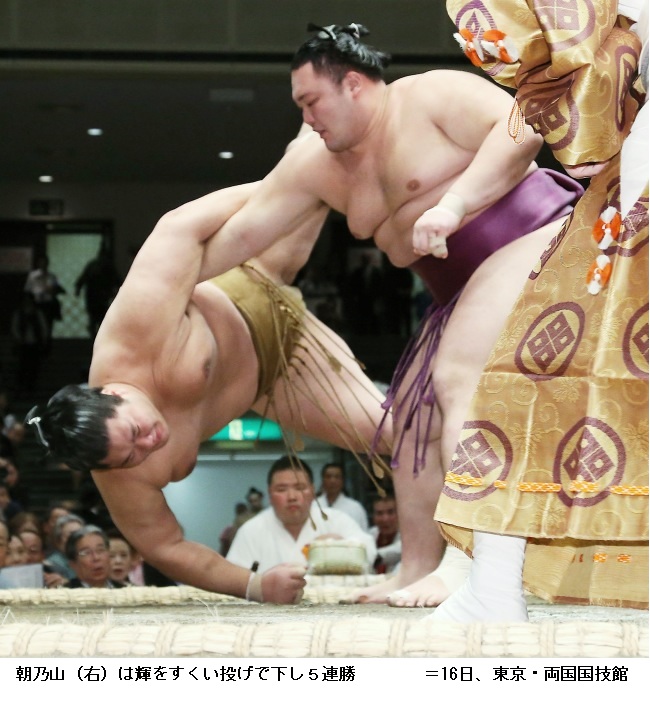 平幕でただ一人1敗を守った朝乃山は「足が自然に出る感じだった。きょうは力を抜いていった。自分の相撲を意識すること。考えながらやる」と話していました。