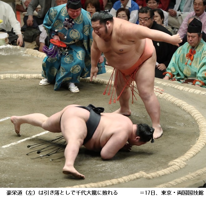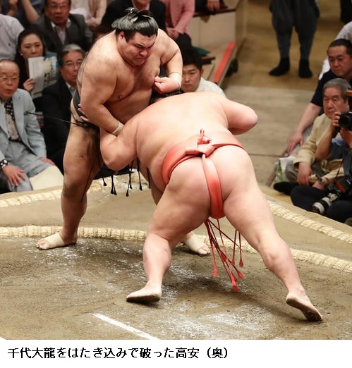 千代大龍に大関 豪栄道は千代大龍が引き落としで勝ちました。高安と豪栄道の両大関はともに3勝3敗となりました。