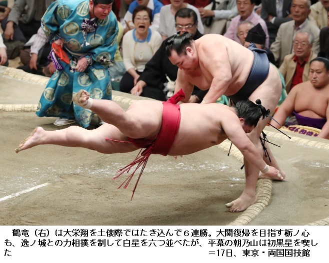 横綱 鶴竜は平幕の大栄翔を土俵際ではたき込んで6連勝。鶴竜は「最後は体が反応した。いい相撲ではないけど、余裕があった」と話していました。 (NHK WEB NEWS 2019年5月17日 18時57分)