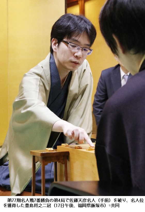 豊島二冠が名人獲得 将棋、平成生まれ初の名人 ―― 将棋の第77期名人戦7番勝負の第4局は16、17の両日、福岡県飯塚市で指され、挑戦者で先手の豊島将之二冠(29)が133手で佐藤天彦名人(31)を破り、4連勝で初の名人位を獲得した。これで王位、棋聖と合わせ自身初の三冠となった。