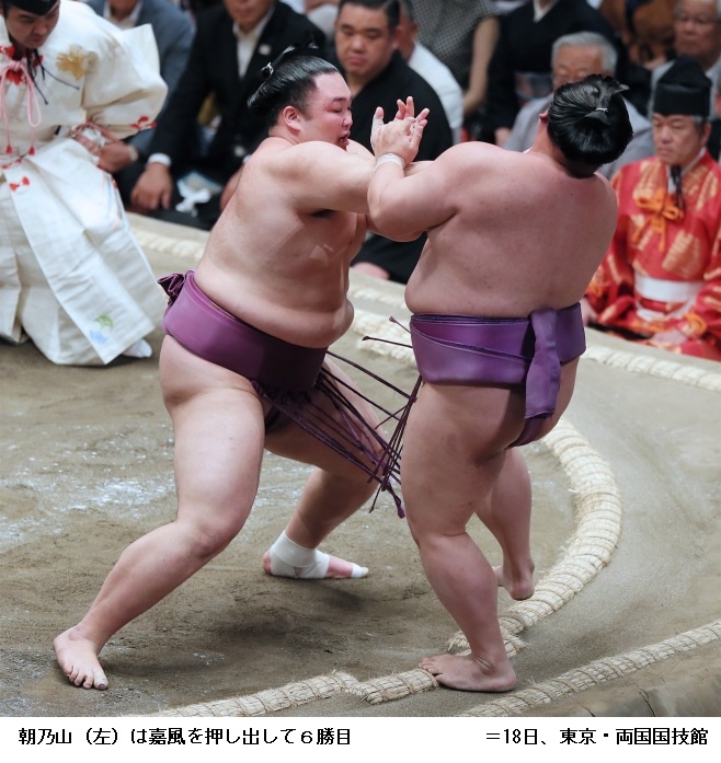 朝乃山に嘉風は、朝乃山が押し出しで勝って6勝1敗です。