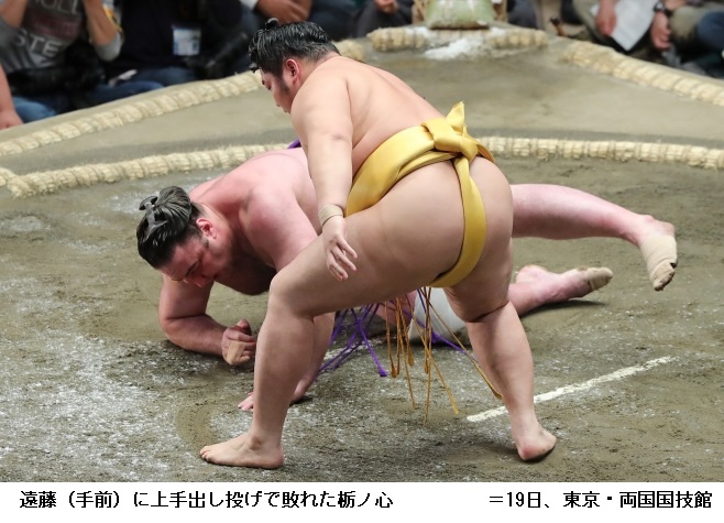 栃ノ心に遠藤は遠藤が上手出し投げ。大関復帰を目指す栃ノ心は、今場所初黒星です。