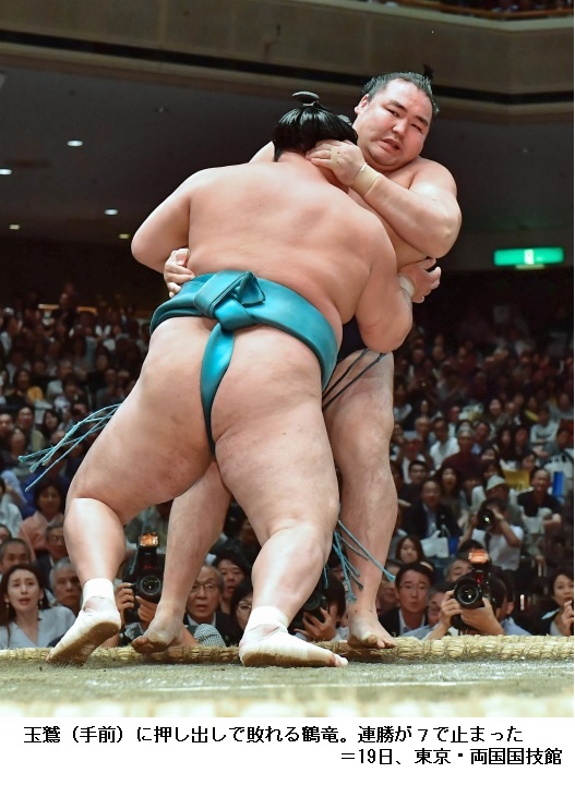 横綱 鶴竜に玉鷲は玉鷲が押し出しで勝って鶴竜に土がつきました。