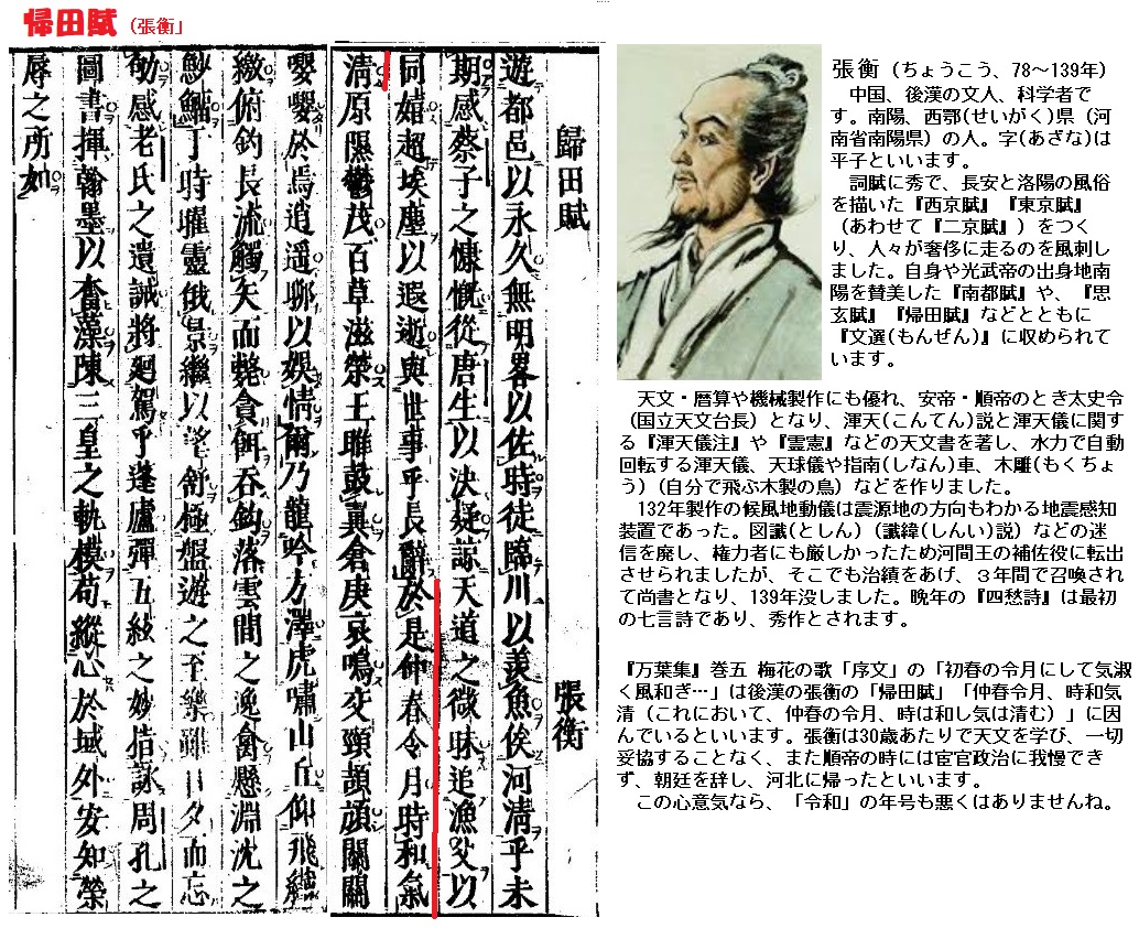 文選巻十五に収められた、後漢の文学者であり科学者の張衡(ちょうこう)が詠んだ「帰田賦」には、「於是仲春令月 時和氣清」(これにおいて、仲春の令月、時は和し気は清む)とあります。