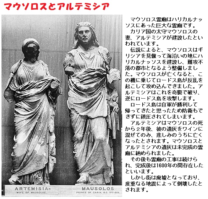 マウソロスは、カリア国の首都をハリカルナッソス(現在のトルコ共和国ボドルム)に定め、周囲の地域も支配下に置きました。この霊廟は、マウソロスの死後に妃アルテミシアが夫のために建造したといわれているが、実際にはマウソロスの生存中に建造が開始されたと考えられています。マウソロスの死から3年後、アルテミシアの死から1年後にあたる紀元前350年に完成したといわれています。
