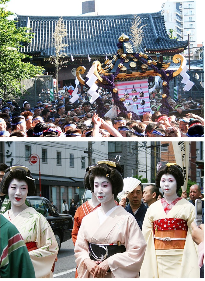 宮戸川(隅田川)で投網をしていた、檜前浜成(ひのくまのはまなり)・竹成(たけなり)の兄弟が捧持された観音像を土師真中知(はじのまつち)が自宅にお祀りしたのが浅草寺のはじまり。のちに土師真仲知命と檜前浜成命・竹成命の三名を三社権現と称しお祀りされたのがこの浅草神社の起源となる。江戸時代から現代において当代随一の荒祭りとして全国的に知られるようになった三社祭は、江戸三大祭りのひとつに数えられ、下町の情緒を今に残す名物行事になっている。
