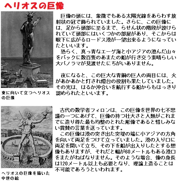 現在アメリカ、ニューヨーク港に建つ自由の女神の高さが46.3メートルだから、古代の人々ならずしても、途方もない大きさの像でした。だが、資料が少ないため、その実態は謎に包まれたままです。