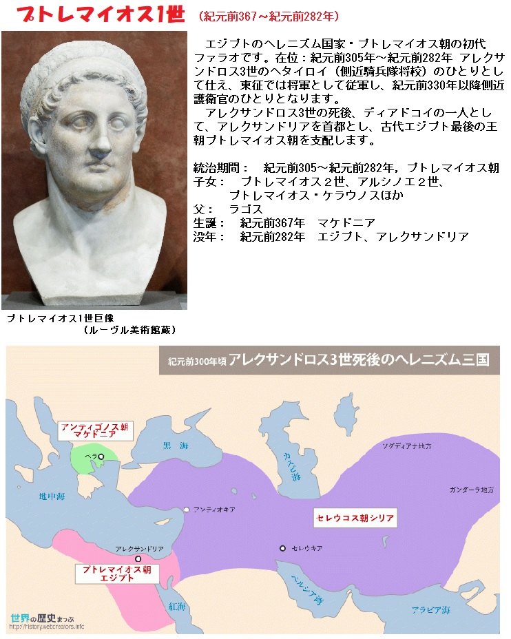 紀元前332年、アレクサンドロス3世によってナイル河口にアレクサンドリアが建設されました。アレクサンドロスの死後、エジプトは彼の部下であるプトレマイオス1世の統治下に置かれ、ここにプトレマイオス朝が開かれました。