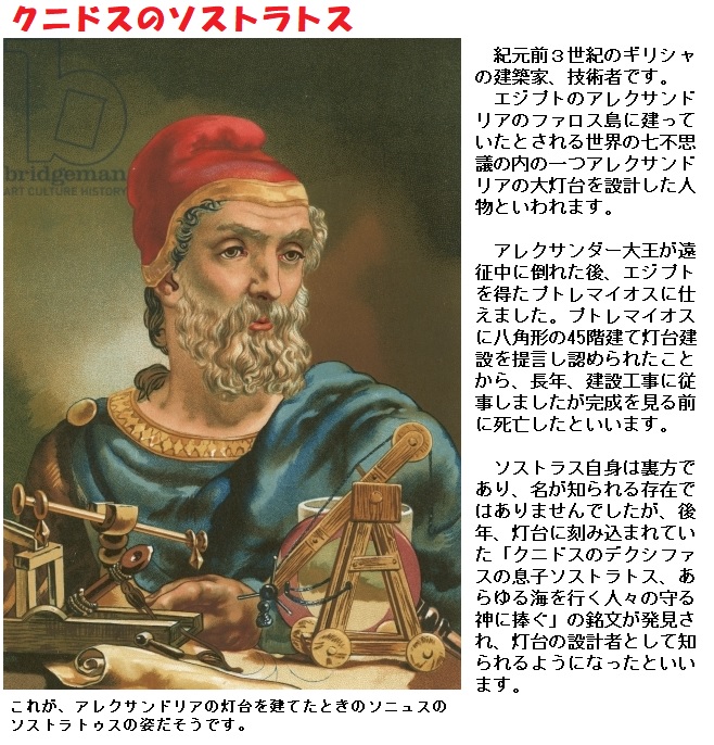 建造の指揮はクニドスのソストラトスに任せられました。建造地にはアレクサンドリア湾岸のファロス島が選ばれました。島とアレクサンドリア港との間は人工的な通路で結ばれた。紀元前305年から工事を開始し、完成したのはプトレマイオス2世の代でした。