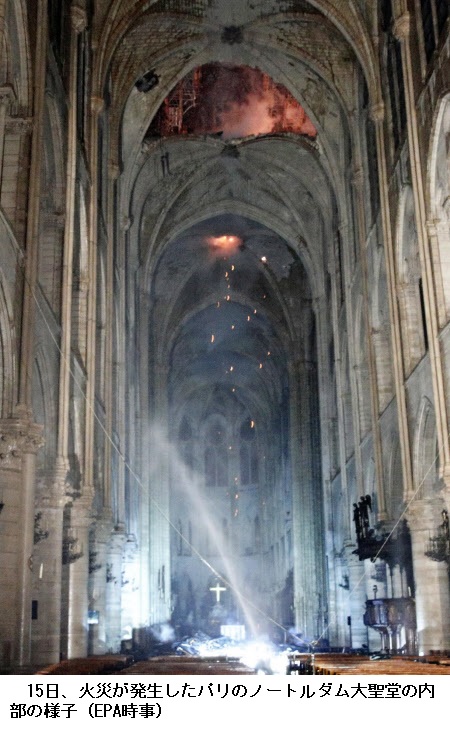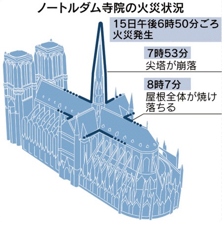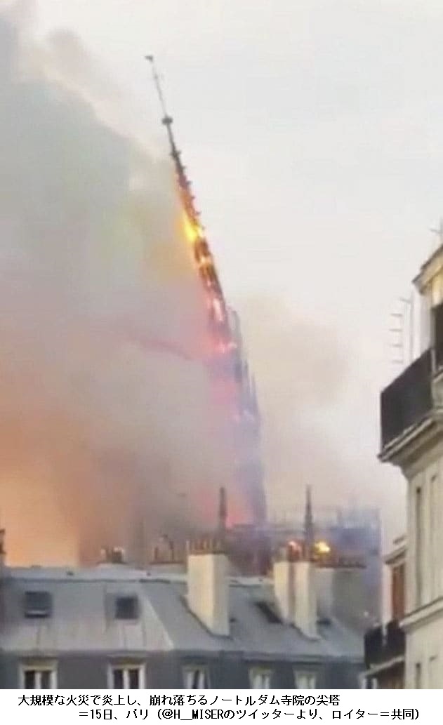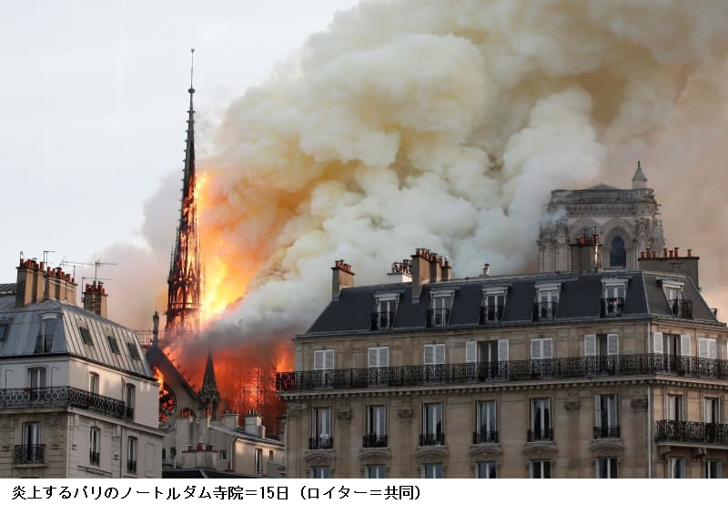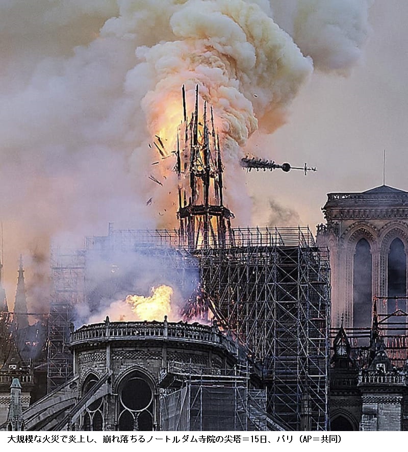 パリのノートルダム寺院で大火災 世界遺産の尖塔崩落、失火の疑い ―― 【パリ共同】パリ中心部の観光名所で世界遺産のノートルダム寺院(大聖堂)で15日午後6時50分(日本時間16日午前1時50分)ごろ、高層部から出火、屋根が炎上する大火災となり、高さ約90メートルの尖塔が焼け落ちた。消防当局は16日未明まで懸命の消火活動を続け、建物の崩壊を防いだ。検察当局は失火の疑いがあるとみて捜査を始めた。