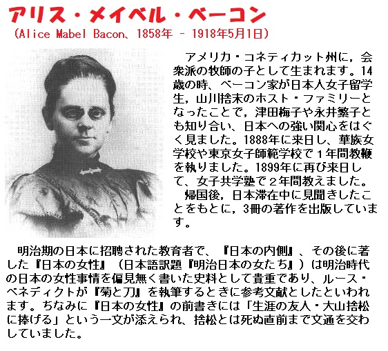 同時に、捨松のホストファミリーだったベーコン家の末娘・アリスも二人と友情を育みました。また、ランマン夫妻に連れ添われて休暇には各地を旅行するなどもしてエンジョイしておりました。