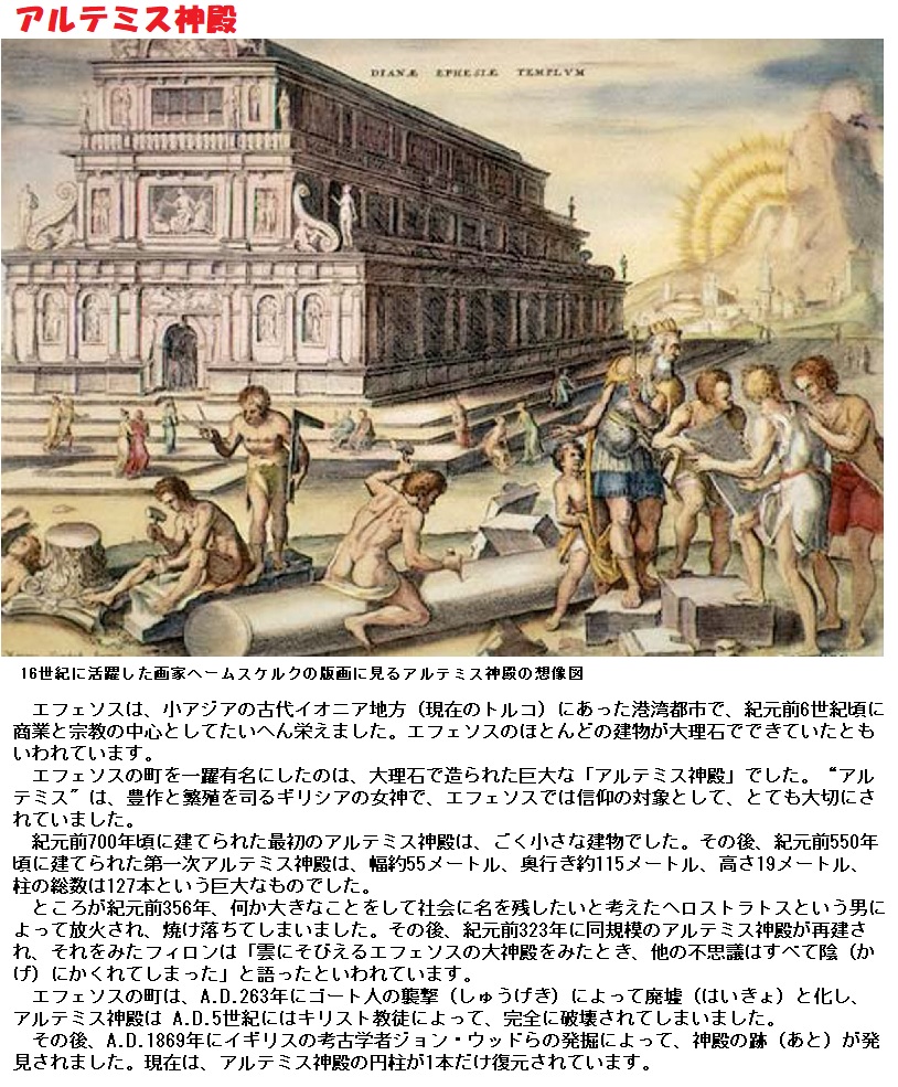 アルテミス神殿 (Artemisium)は、紀元前7世紀から紀元3世紀にかけてエフェソス(現在のトルコ)に存在した、アルテミスを奉った総大理石の神殿です。世界の七不思議のひとつに挙げられていますが、現在は原形をとどめていません。