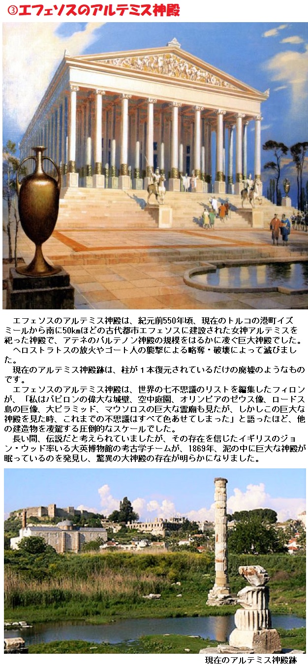 「私は戦車が通りうるほど広いバビロンの城壁を見、アルペイオス河畔のゼウス像を見た。空中庭園も、ヘリオスの巨像も、多くの人々の労働の結集たる大ピラミッドも、はたまたマウソロスの巨大な霊廟も見た。しかし、アルテミスの宮がはるか雲を突いてそびえているのを見たとき、その他の驚きはすっかり霞んでしまった。私は言った、「見よ、オリンポスを別にすれば、かつて日の下にこれほどのものはなかった。」 ―― アンティパトレス、『パラティン詩選集』9巻58