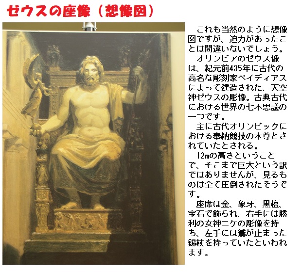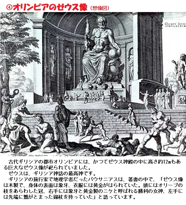 『オリンピアのゼウス像』(オリンピアのゼウスぞう)は、紀元前435年に古代の高名な彫刻家ペイディアスによって建造された、天空神ゼウスの彫像です。古典古代における世界の七不思議の一つです。