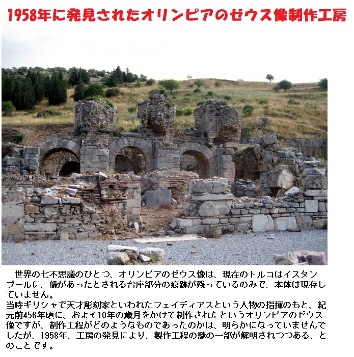 1958年、ゼウス像の建造に使用されたと考えられる工房が発見されました。この発見によってゼウス像の全容の解明が進められましました。
