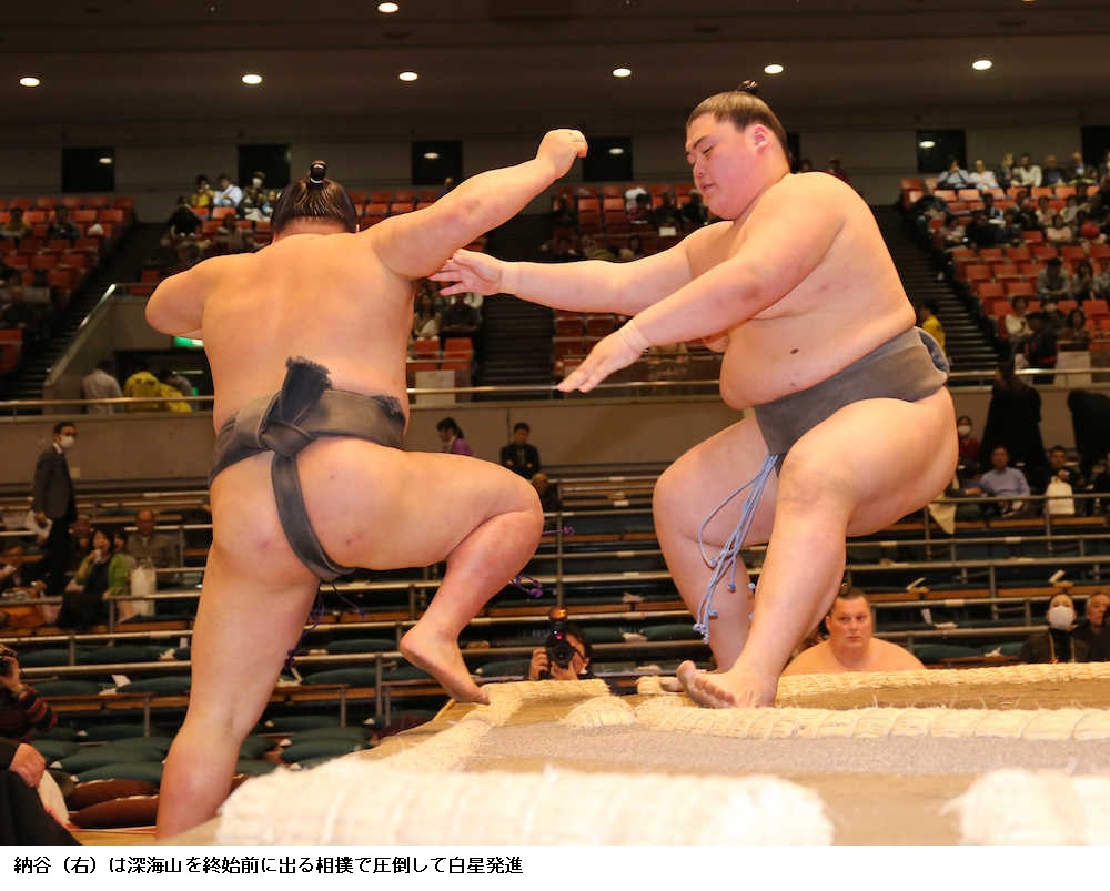 初まげ効果!納谷白星スタート 「眠そうな顔」からキュッと変身 ―― 初めてまげ姿で本場所の土俵に上がった幕下の納谷(19=大嶽部屋)が、押し出しで深海山を下し白星スタートを切った。 立ち合いから前に出て相手のいなしにもうまく反応し、危なげのない相撲内容だった。