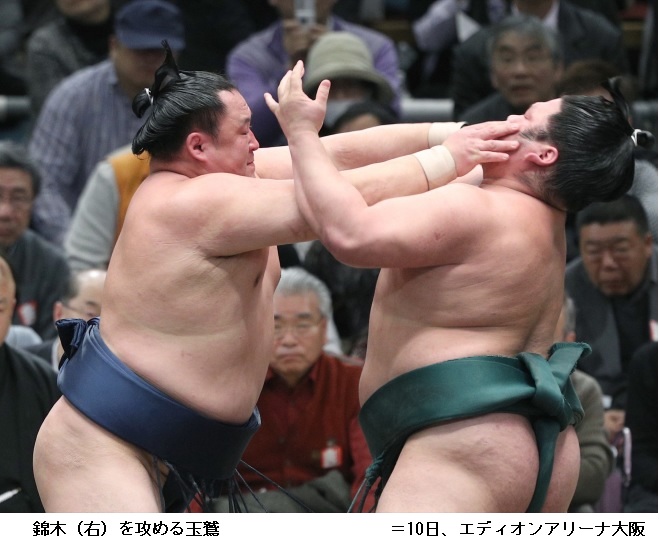▼錦木に横綱 白鵬は、白鵬が寄り切りで勝ちました。白鵬は初日から6連勝です。