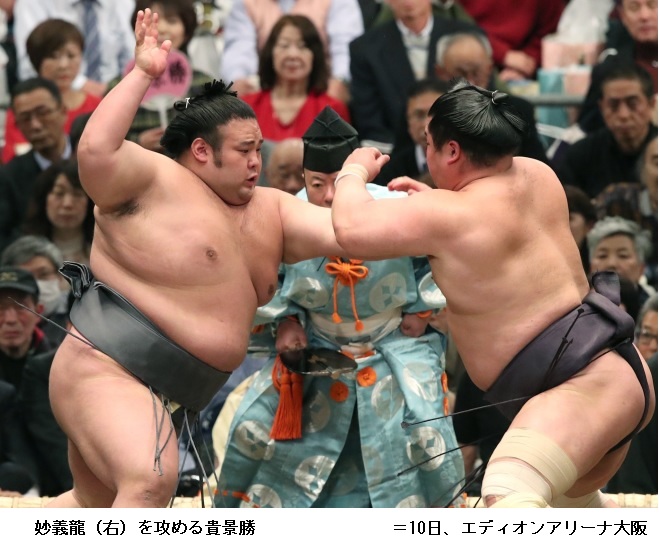 ▼大関昇進のかかる貴景勝に妙義龍は、貴景勝が盤石の相撲で押し出しで勝ちました。